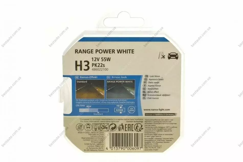 Автолампа H3 12V 55W PK22 Range Power White (4500K) (к-кт 2 шт)) NARVA 486022100