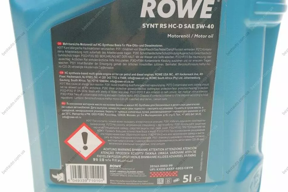 Олива 5W40 HIGHTEC SYNT RS HC-D (5L) (BMW LL-01/MB 229.5/Porsche A40/VW 502 00/505 00) ROWE 20163-0050-99