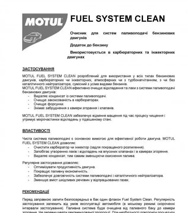 Motul Fuel System Clean - це очищувач для паливної системи двигунів, що працюють на бензині. Підходить для атмосферних або турбованих двигунів, оснащених каталітичним нейтралізатором або без нього.